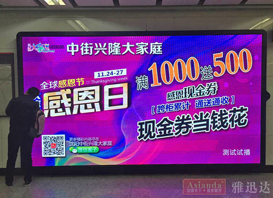此次坐落在沈陽地鐵的液晶廣告大屏是在成都智元匯文化傳媒股份有限公司的指導(dǎo)下由深圳市雅迅達液晶顯示設(shè)備有限公司全程調(diào)試安裝的,這是繼上一次智元匯和雅迅達合作完成杭州地鐵項目之后,再一次將多媒體電子大屏搬上地鐵顯示信息化平臺。這其中就包括沈陽地鐵1號線、2號線奧體中心、東中街站、工業(yè)展覽館、火車站、青年大街、三臺子站、沈陽北站、鐵西廣場、于洪廣場站等在內(nèi)的地鐵廣告大屏項目。