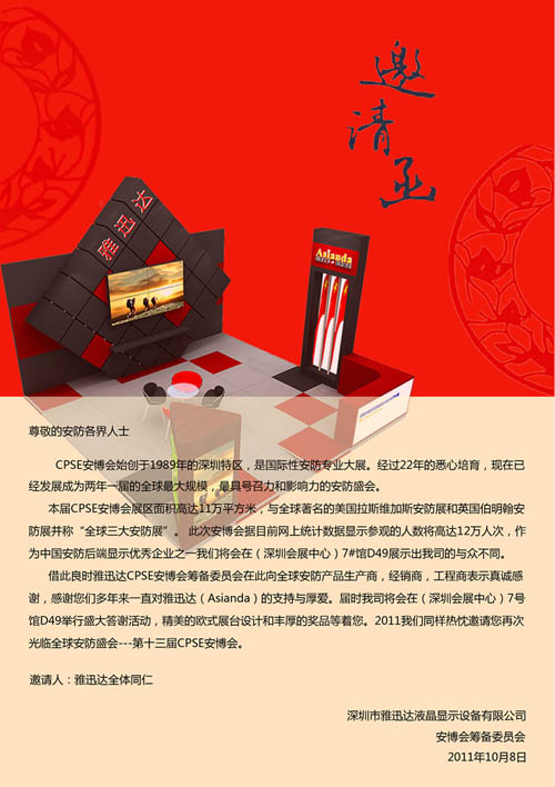 借此良時雅迅達(dá)CPSE安博會籌備委員會在此向全球安防產(chǎn)品生產(chǎn)商,經(jīng)銷商,工程商表示真誠感謝,感謝您們多年來對雅迅達(dá)(Asianda)的支持與厚愛。屆時我司將會在(深圳會展中心)7#館D49舉行盛大答謝活動,精美的歐式展臺設(shè)計(jì)和豐厚的獎品等著您。2011我們同樣熱忱邀請您再次光臨全球安防盛會---第十三屆CPSE安博會。