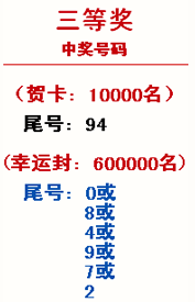 獎品為郵樂網兌獎專區(qū)內的商品,包括:家居類、生活類、小家電類、郵政特色產品(DIY明信片,中郵人壽卡、中郵閱讀卡)等,中獎者可自行選擇1中;郵政明信片套裝(雕刻版《靈蛇報恩》明信片套裝、《迪士尼祝??餍牌籽b》)可由中獎者在兌獎網點直接兌換。