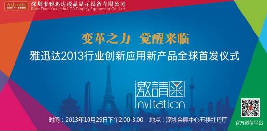 我們在行業(yè)化應(yīng)用方面的積極行動(dòng)、豐富經(jīng)驗(yàn)、完善的產(chǎn)品和解決方案體系,將再一次彰顯我們作為液晶顯示領(lǐng)域領(lǐng)先企業(yè)的能力和責(zé)任。在安防行業(yè)迅速發(fā)展的今天,唯有專業(yè)才能走得更遠(yuǎn),我們期待與您攜手,為行業(yè)創(chuàng)新應(yīng)用深入發(fā)展增添動(dòng)力,共同推動(dòng)商用高端顯示的“綠色化”進(jìn)程!“雅迅達(dá)2013行業(yè)創(chuàng)新應(yīng)用新產(chǎn)品全球首發(fā)儀式”,誠邀您拔冗出席!
