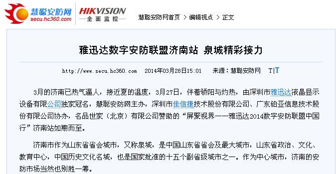 慧聰安防網(wǎng)、CPS中安網(wǎng)、安防市場(chǎng)報(bào)、安防知識(shí)網(wǎng)、中國(guó)安防展覽網(wǎng)、中國(guó)安防網(wǎng)、千家安防網(wǎng)等安防行業(yè)媒體更是爭(zhēng)相對(duì)雅迅達(dá)此次活動(dòng)進(jìn)行了多方位的報(bào)道,“雅迅達(dá)”三個(gè)字高頻率的出現(xiàn)在各大行業(yè)媒體網(wǎng)站首頁及要聞區(qū)。