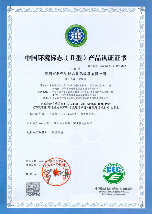 近日,深圳市雅迅達液晶顯示設(shè)備有限公司榮獲中國環(huán)境標志產(chǎn)品認證證書。