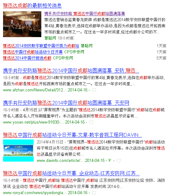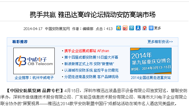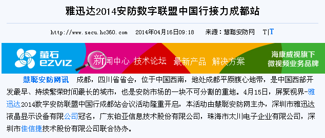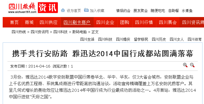 雅迅達(dá)中國(guó)行成都站活動(dòng)與成都2014安防展會(huì)同期舉行,在西南安防市場(chǎng)形成規(guī)模效應(yīng),成都當(dāng)?shù)孛襟w予以關(guān)注。報(bào)道中,眾媒體紛紛對(duì)雅迅達(dá)發(fā)布的新技術(shù)和展品展示極大興趣。