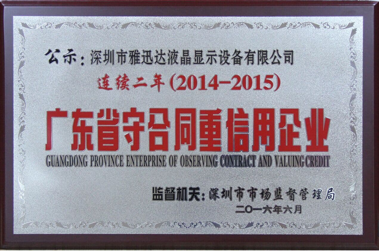 雅迅達2014-2015連續(xù)兩年榮獲“廣東省守合同重信用企業(yè)”稱號 近日,2015年度廣東省守合同重信用企業(yè)授牌儀式圓滿舉行。經(jīng)過廣東省網(wǎng)商協(xié)會的公示推薦,深圳市雅迅達液晶顯示設(shè)備有限公司順利通過廣東省工商局的最終評審,獲得“廣東省守合同...